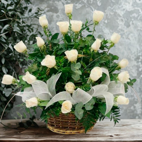 Incluye 24 rosas blancas, frescos follajes y una base decorativa que realza su belleza para un regalo inolvidable. 🌿🎀
