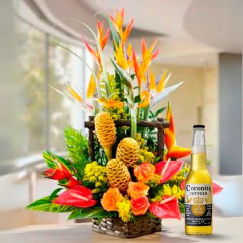 Sorprende con el Arreglo Floral Exótico Apolo de la Feria de Flores. 🌺✨ Flores exóticas, follajes frescos y una botella de cerveza para un regalo original y especial. 🍻🌿