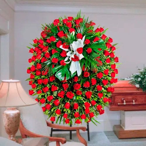 Este arreglo fúnebre está compuesto por rosas rojas, símbolo de amor profundo, respeto y memoria eterna. Los follajes verdes aportan frescura y equilibrio, representando esperanza y renovación. 🌿❤️